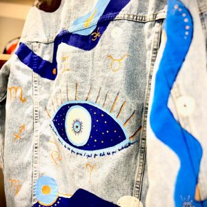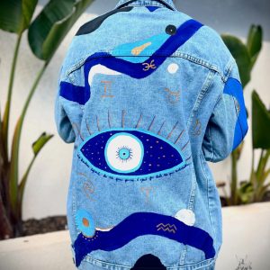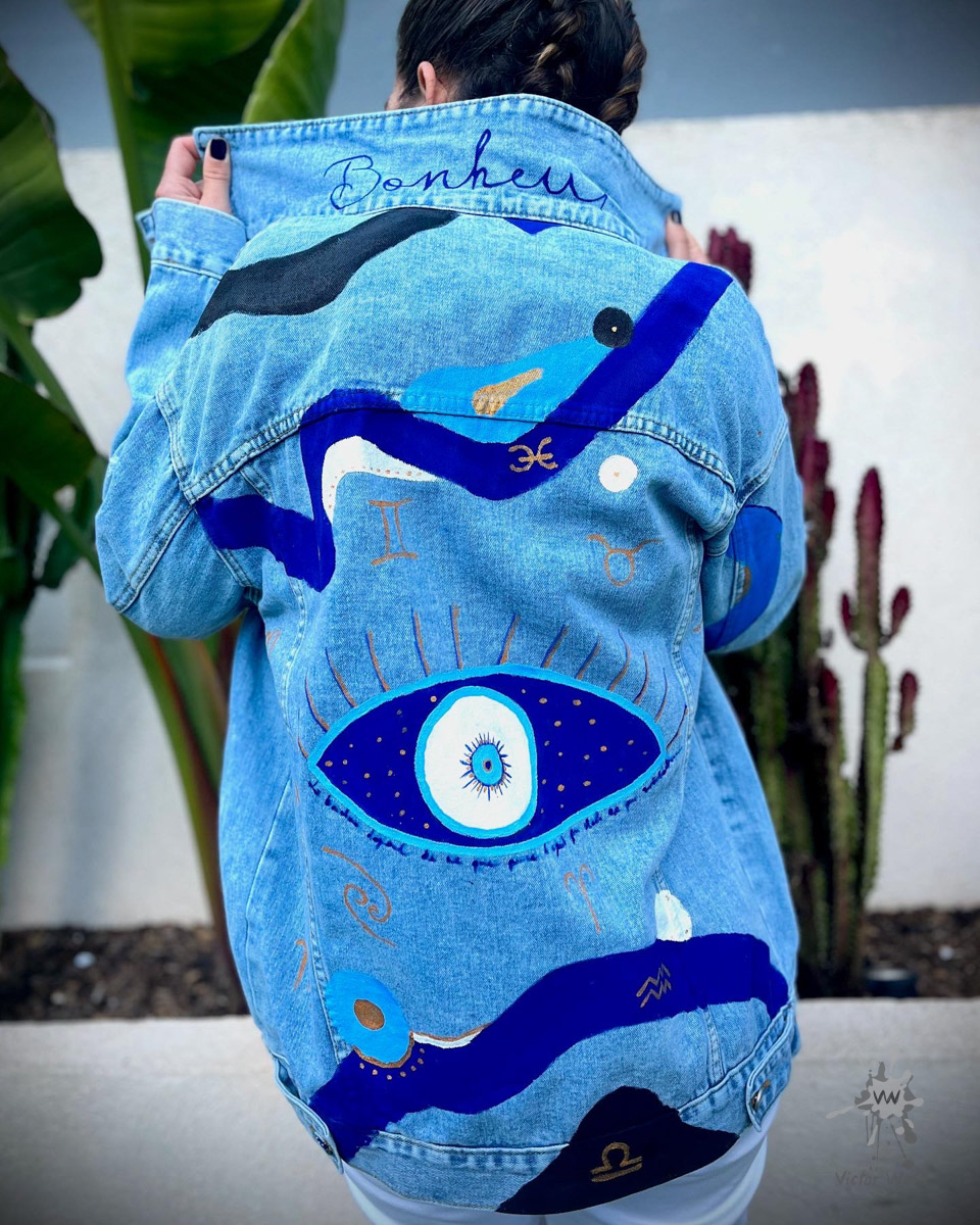 “L’œil bleu grec protège, les signes du zodiaque nous rappellent notre lien Ă  l’univers, et le mot Bonheur, simple et puissant, ancre l’intention. Cette veste est un talisman. Une armure douce pour affronter la rĂ©alitĂ© avec force et poĂ©sie.”