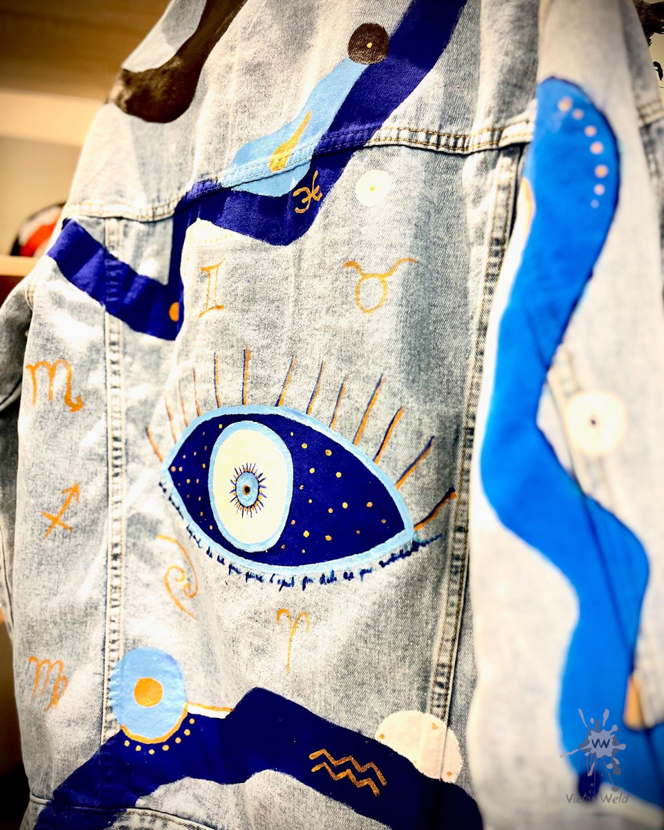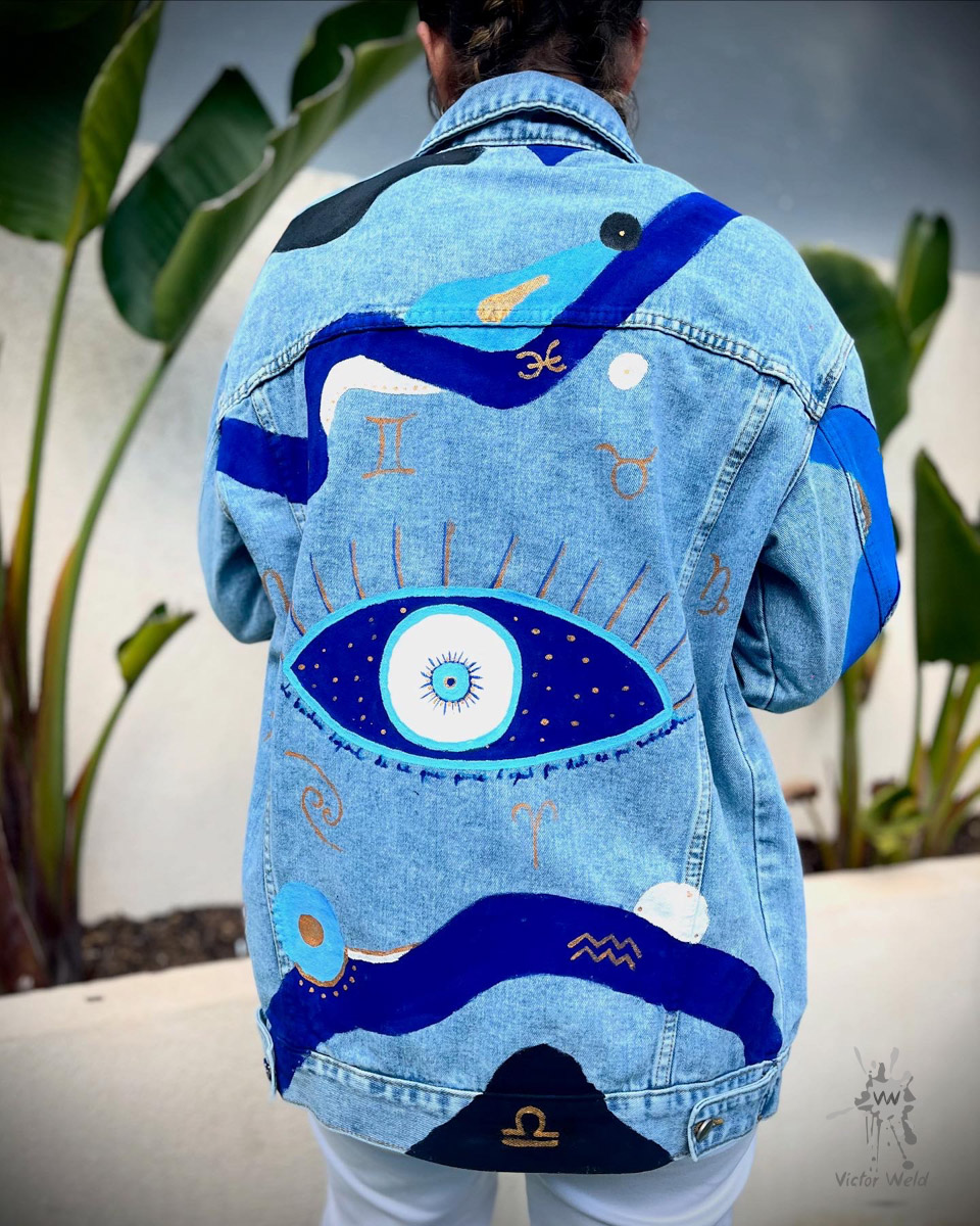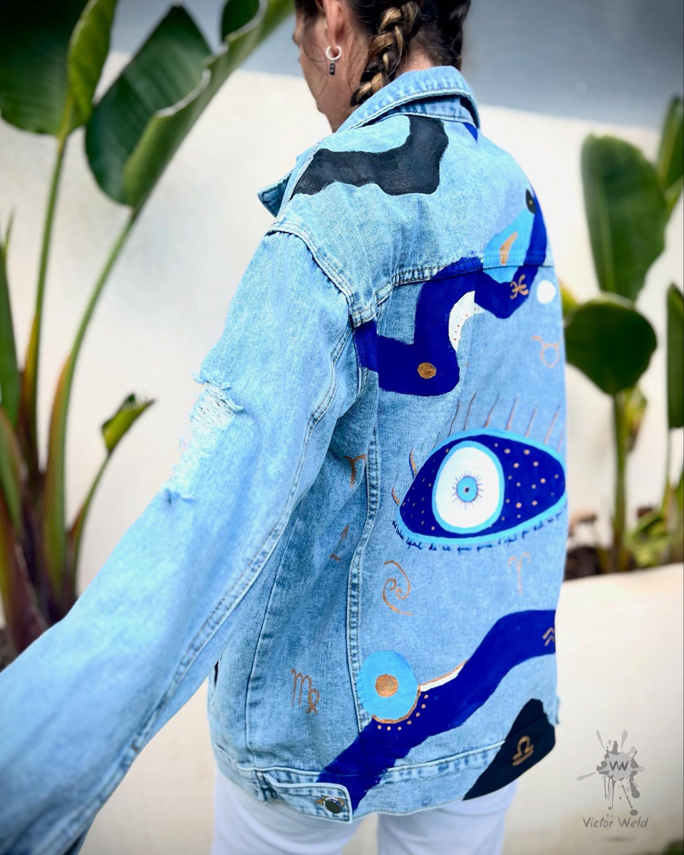 Entrez dans un monde mystique et lumineux avec cette veste en jean oversize bleu clair, taille M. Modèle N°32 de la collection Victor Weld, cette pièce mêle symboles, couleurs et spiritualité dans une œuvre puissante à porter sur soi.