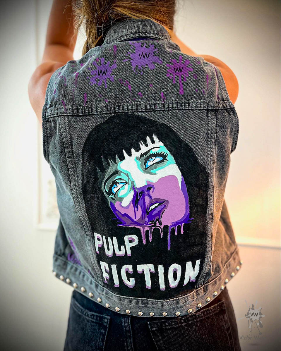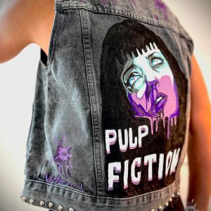 🎨 Au dos, une peinture saisissante : le visage d’une femme, directement inspirée de l’héroïne culte de Pulp Fiction. En gros plan, son maquillage dégouline lentement, ses yeux bleu électrique semblent perdus dans un ailleurs inaccessible, et son regard raconte une histoire silencieuse.