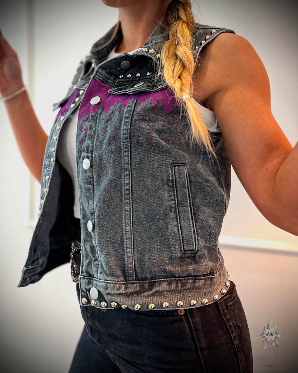 Chaque pièce Victor Weld est une œuvre d’art unique, peinte à la main et pensée comme une extension de l’âme. Le modèle N°27, en taille S, est une veste noire sans manches, soulignée de clous argentés sur les épaules pour une touche rock assumée.